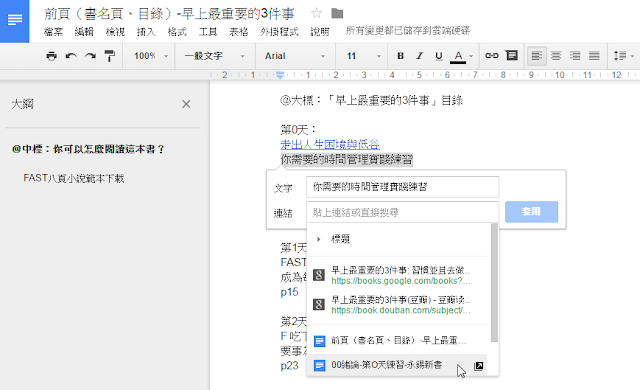 例如我正在撰寫論文、一本書,我的每個章節可能都是一個 Google 文件檔案,這時候我想要讓相關的文件之間彼此連結,或是在目錄上連結對應的 Google 章節文稿。